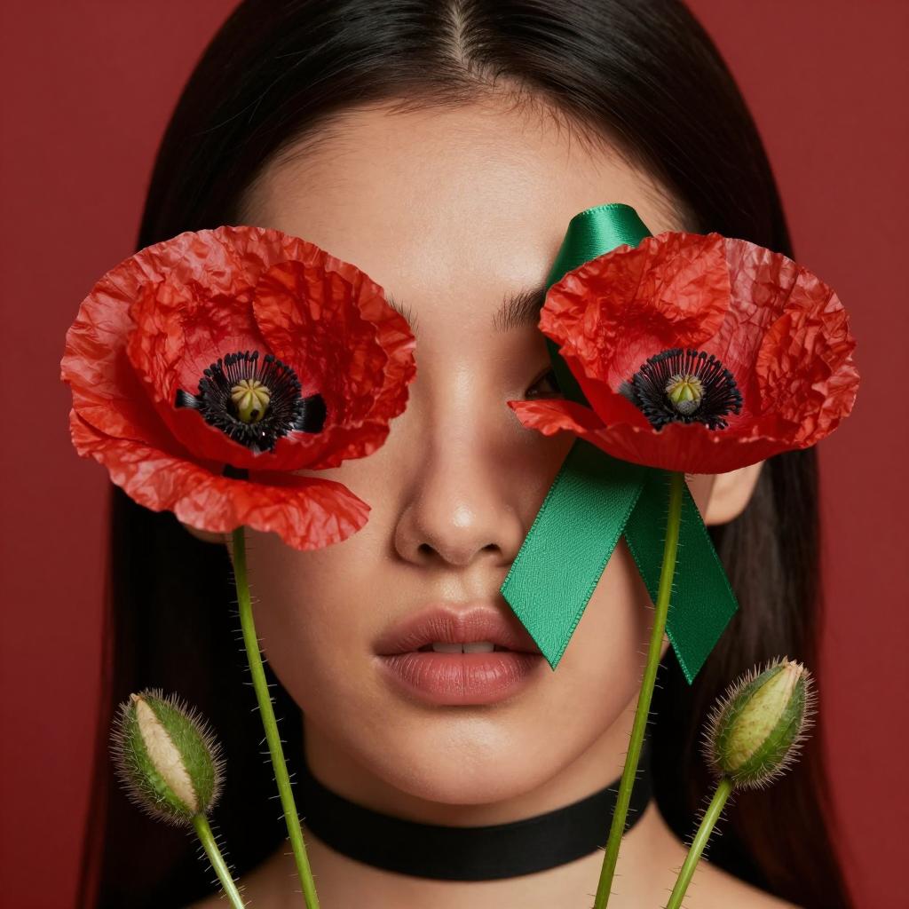 Photograph of a woman with dark hair, olive skin, and full lips. A green ribbon covers her right eye. Two red poppies with green stems and buds are in front of her face. She wears a black collar. Red background.