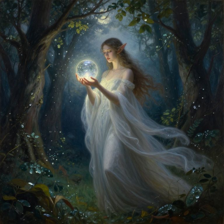 A captivating oil painting transports viewers into an enchanting twilight forest, where vibrant colors dance across the sky as the sun gracefully descends. Ancient trees cast elongated shadows that stretch like spectral fingers towards the heavens, creating a mesmerizing interplay of light and darkness. A mysterious figure draped in shimmering mist wanders through the serene woodland, their face partially concealed by an intricate gossamer veil, evoking curiosity and unease. Each brushstroke is imbued with depth and emotion, inviting audiences to step into a whimsical realm and discover the enigmatic beauty hidden within its hallowed embrace.