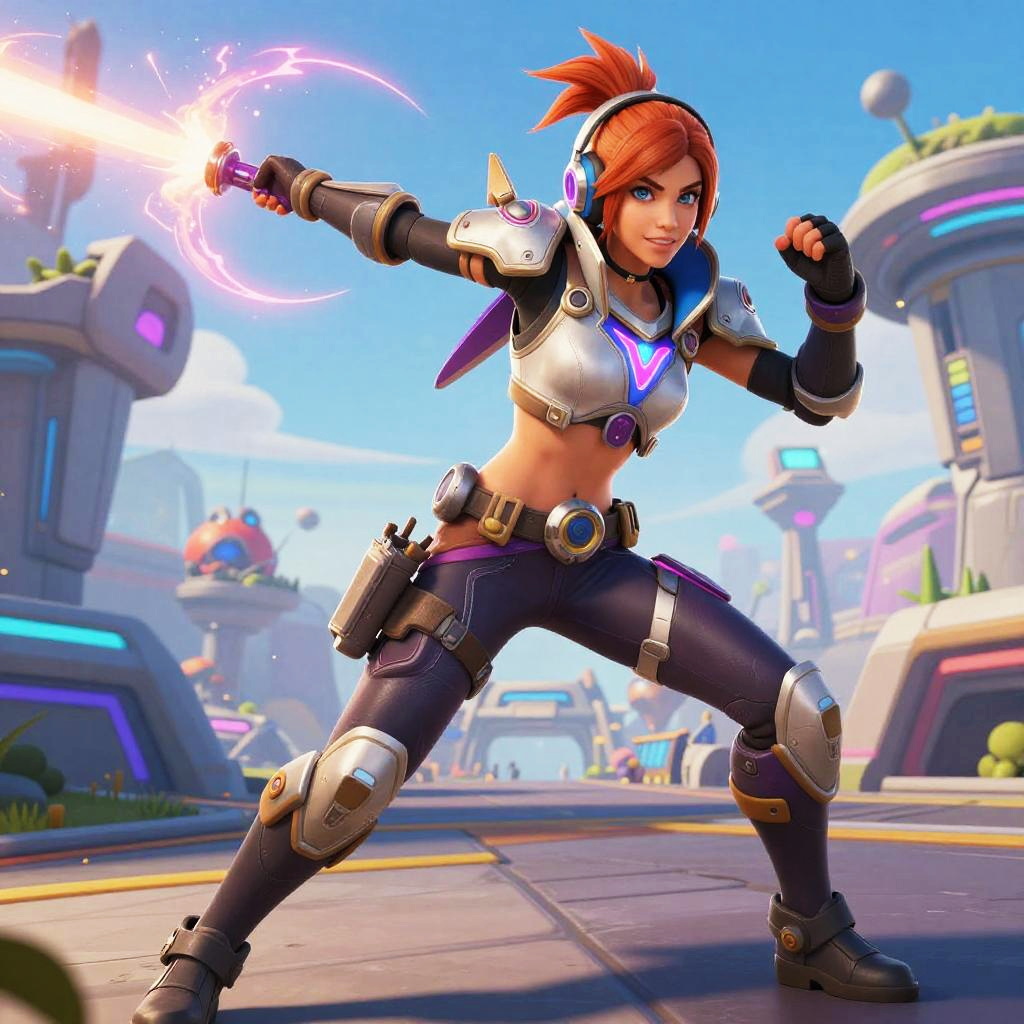 Girl skin Fortnite character in a vibrant futuristic battle arena, wearing high-tech armor with neon accents, dynamic action pose, intense expression, colorful energy effects and detailed environment, digital art style.