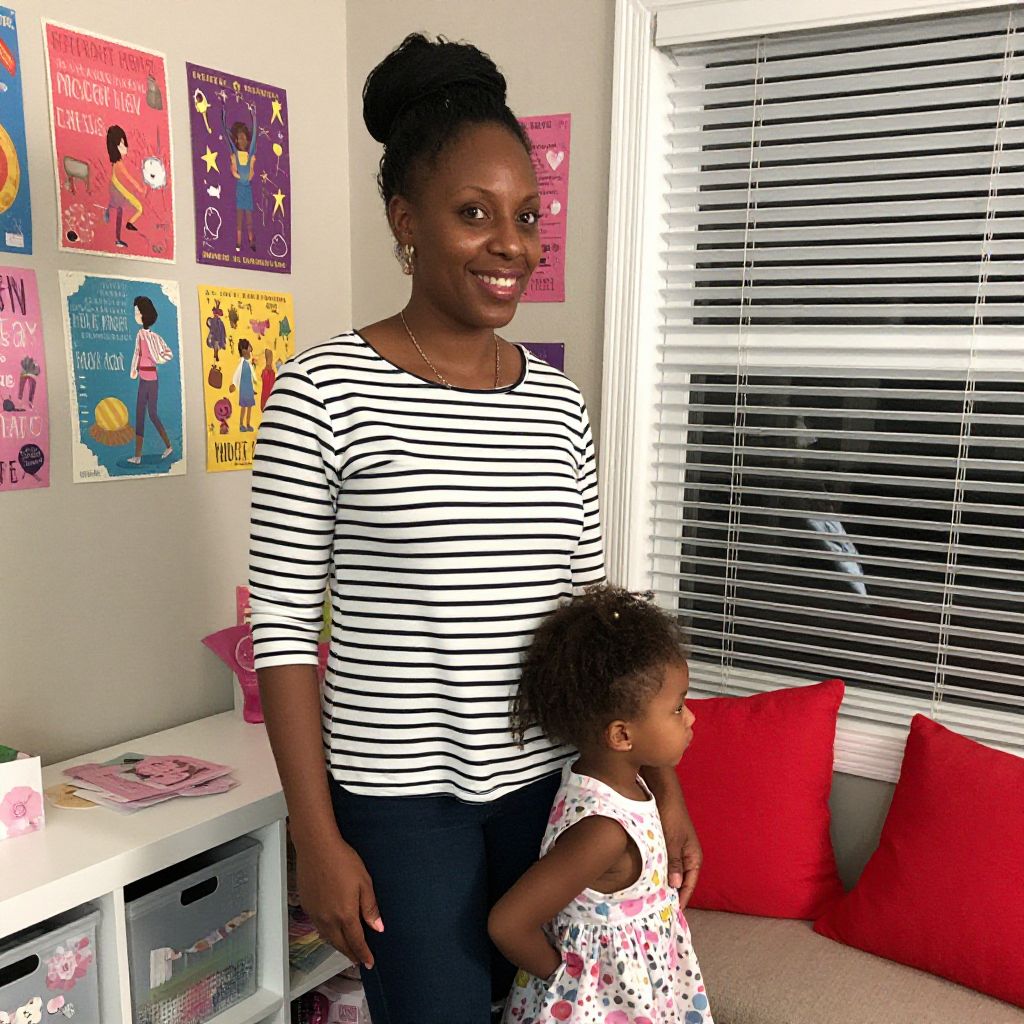 Photograph of a smiling Black woman with curly hair in a striped shirt, standing beside a young Black girl in a floral dress, in a brightly decorated