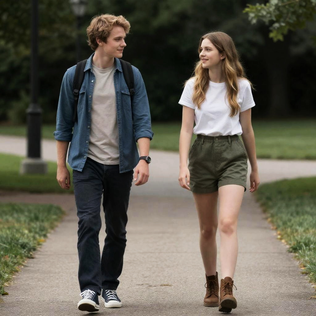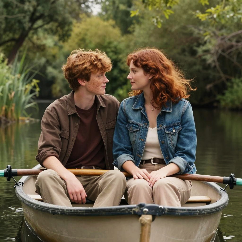 A college-aged boy with short wavy auburn hair and freckles, wearing a denim shirt over a white t-shirt and khaki pants, sits on a small rowboat next to a young woman with waist-length auburn hair. The woman is dressed in a denim jacket over a white top and shorts. They are gazing affectionately at each other on a calm river, surrounded by lush green trees and vegetation. The natural lighting creates a warm, romantic atmosphere.