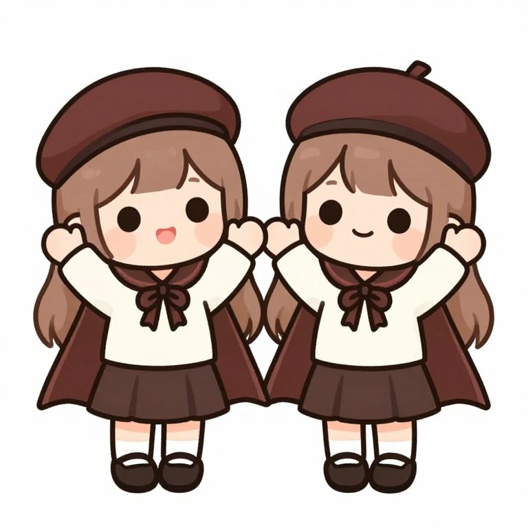 Bleeding best quality, multiple_girls, chibi, Hands up compared to YA, black eyes, light brown hair, cape, beret, mary_janes, transparent_background,