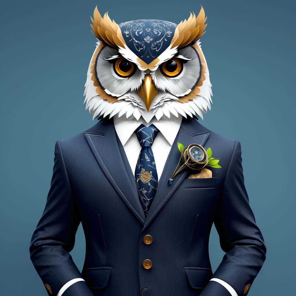 Highly detailed anthropomorphic owl character dressed in a tailored navy blue blazer with gold buttons, white dress shirt, and a patterned navy blue tie. The owl features intricate feather details and a formal look with a decorative lapel pin and pocket square. The background is plain blue, emphasizing the professional and sophisticated style of the subject.