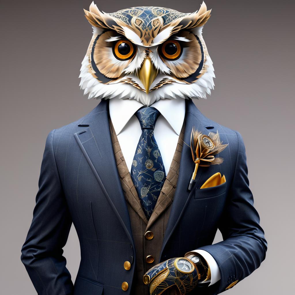 Anthropomorphic owl in a tailored blazer, highly detailed and styled with a professional and formal look.