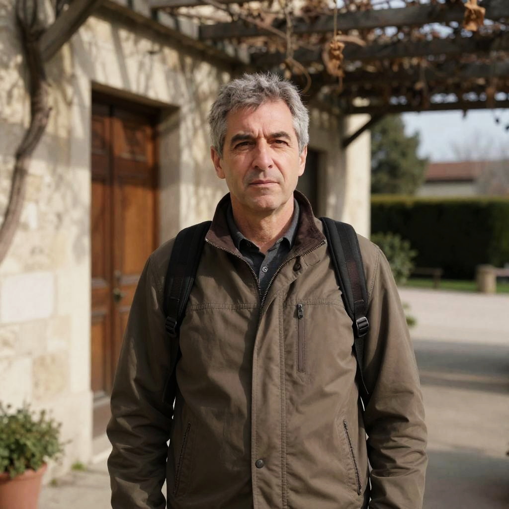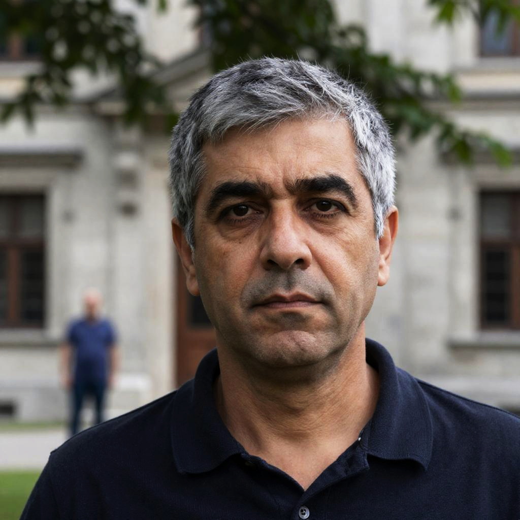 Middle-aged man with gray hair and dark eyebrows, serious expression, wearing dark shirt, in foreground. Background: blurry stone building, person in blue shirt standing, leafy tree overhead.