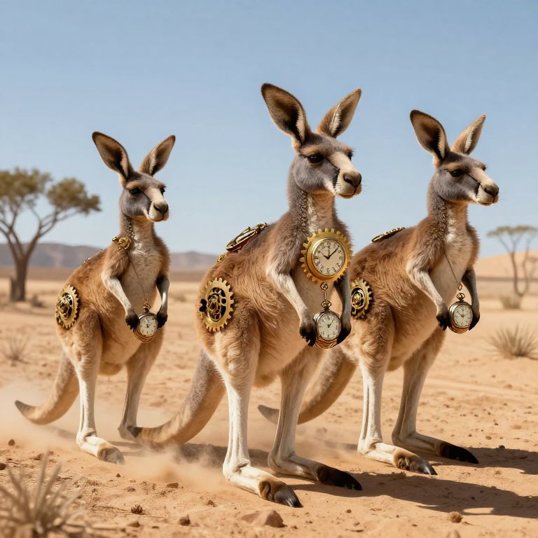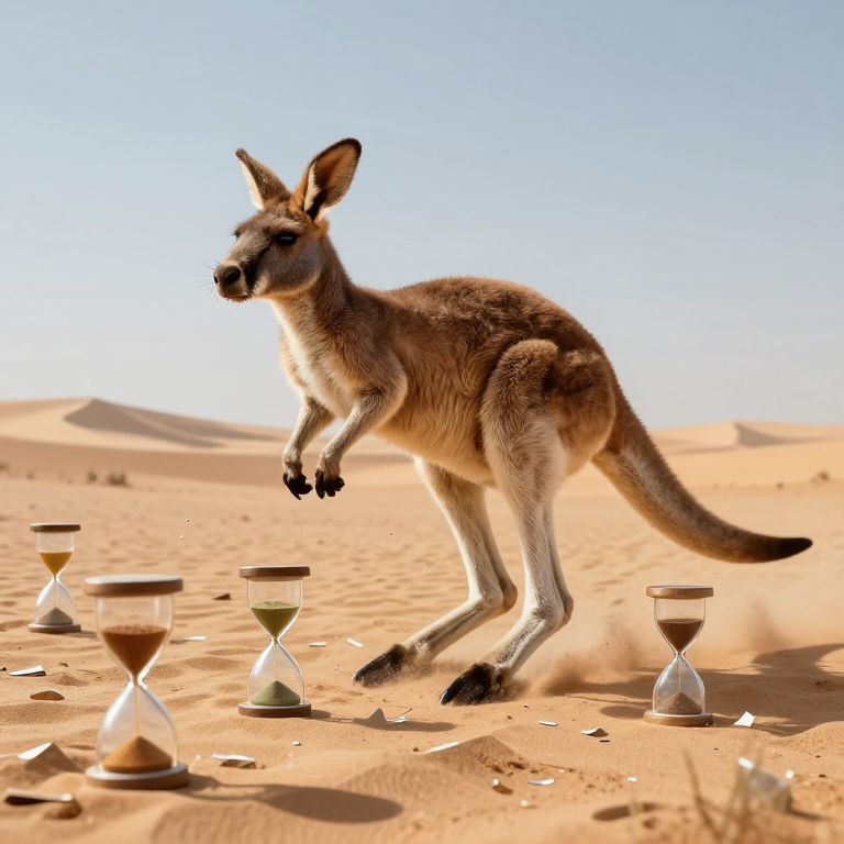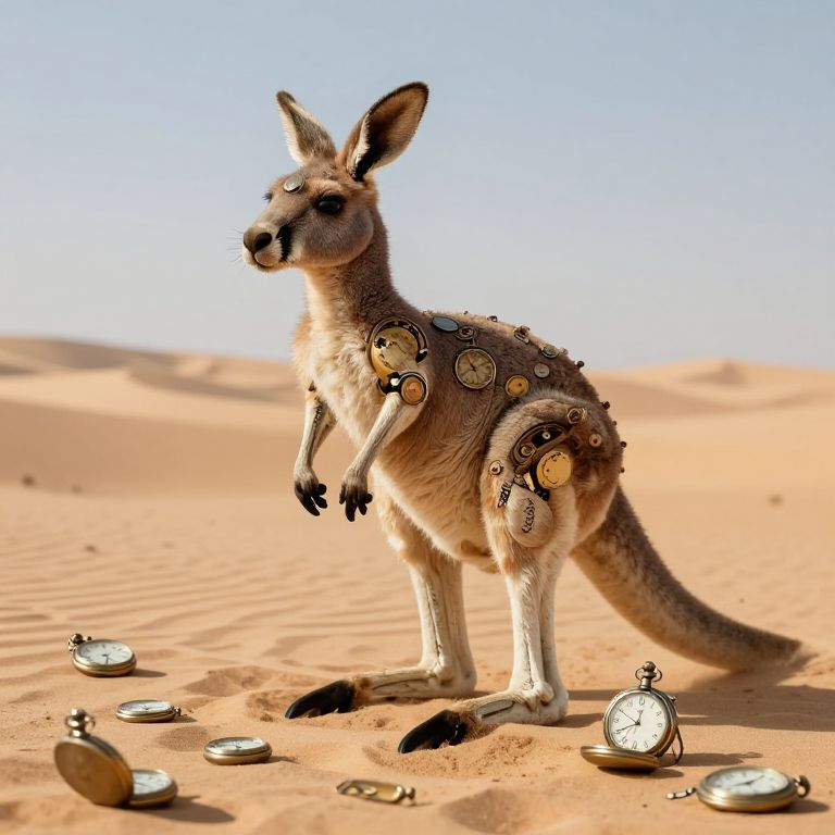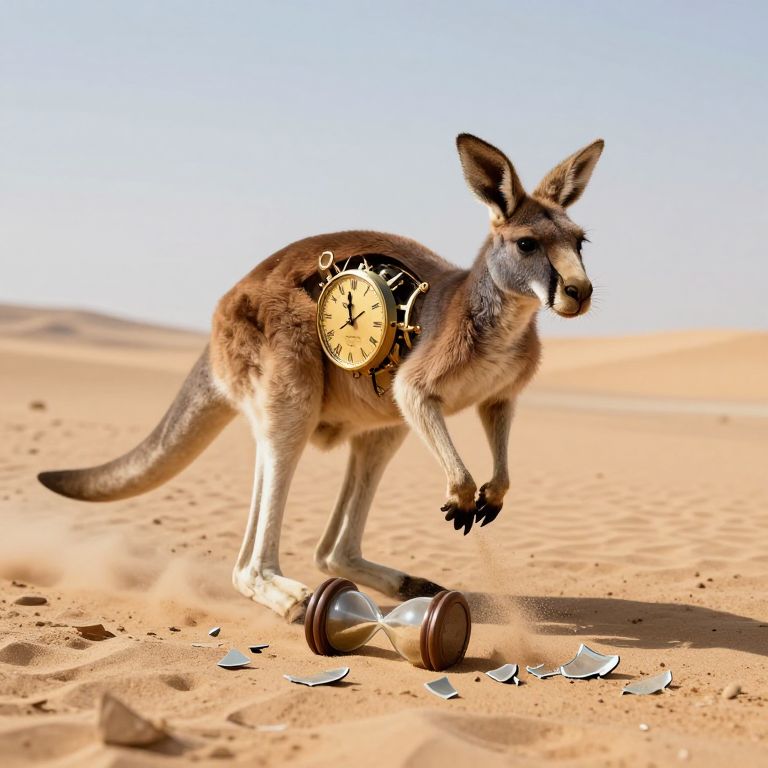 A clockwork kangaroo hops across a desert made entirely of shattered hourglasses, time disintegrating beneath its feet.