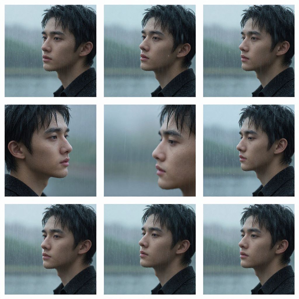 Photographic collage of a young Asian man with wet, dark hair in profile, wearing a dark coat, against a blurry, rainy background. Six identical