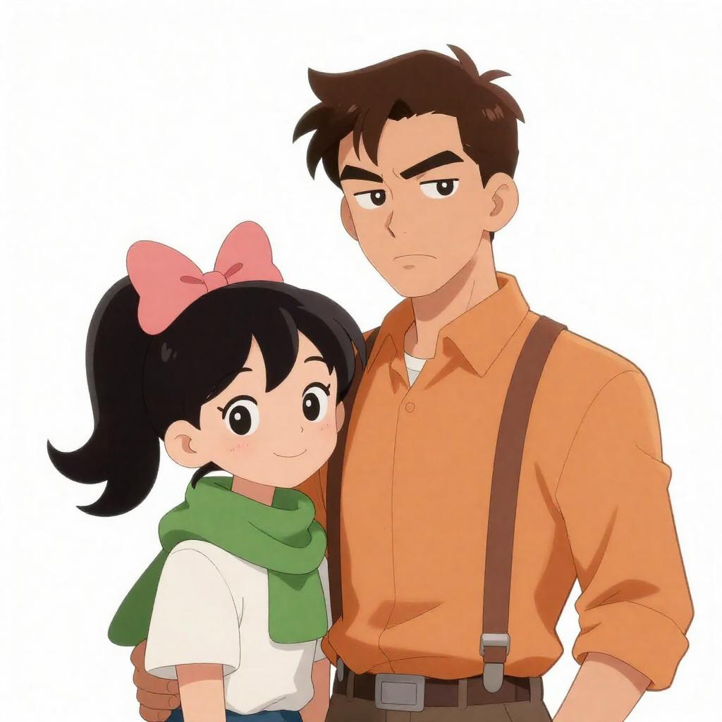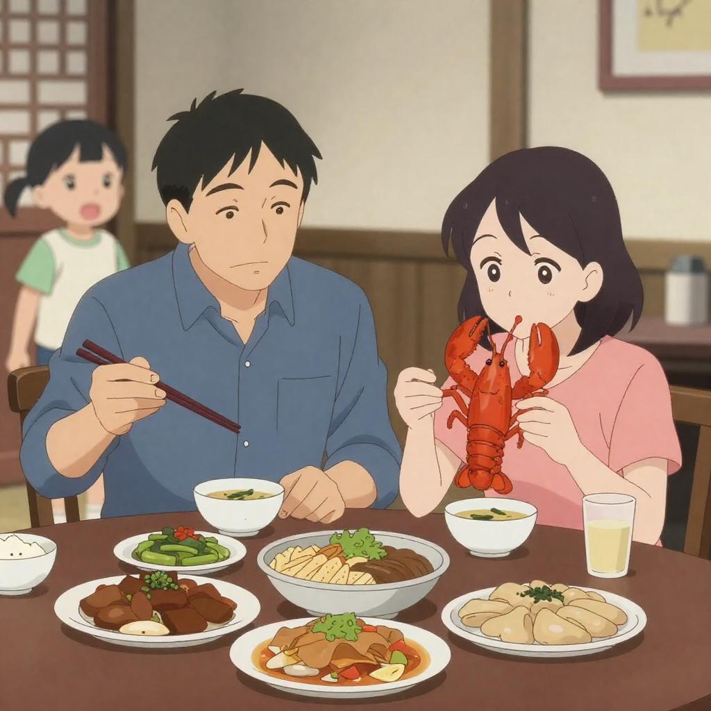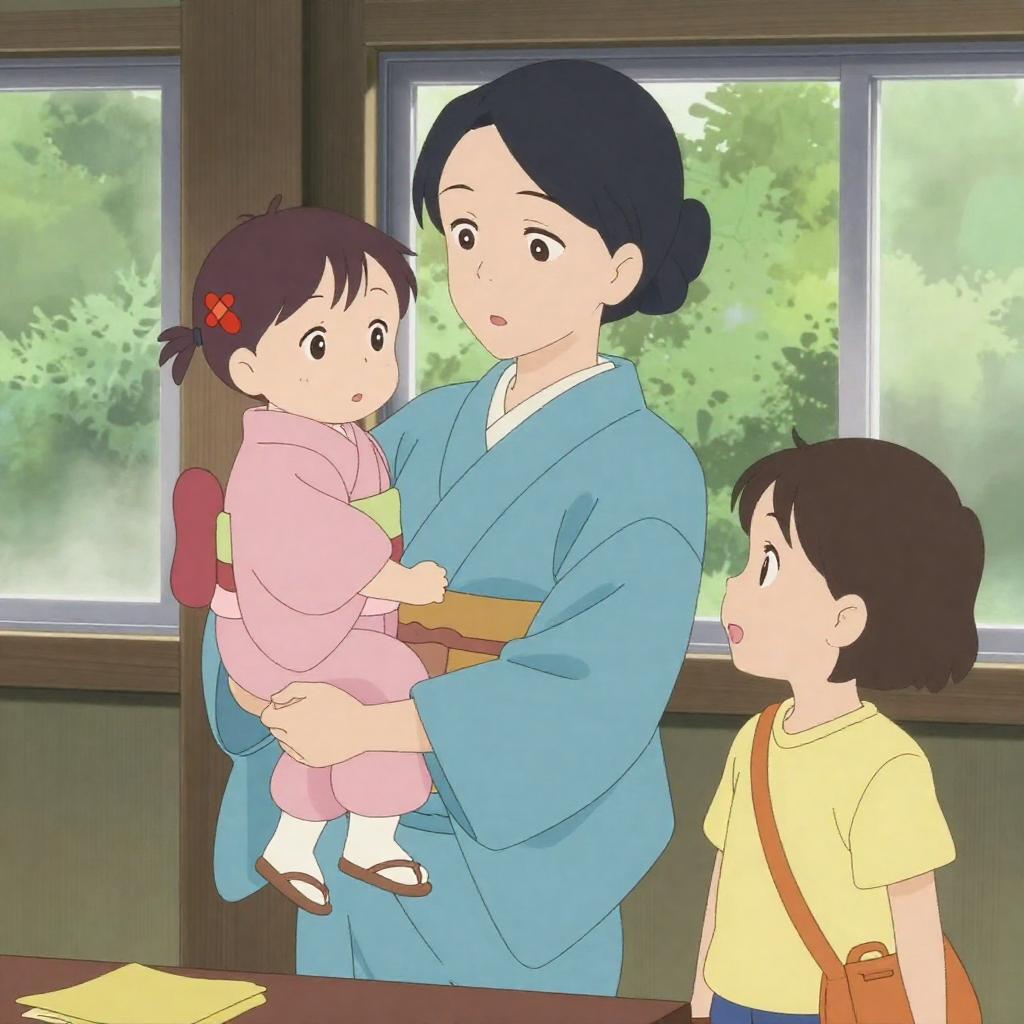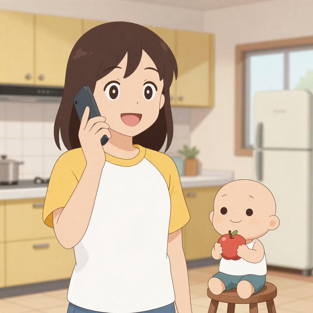 Digital illustration of a kitchen scene. Female character with large eyes, smiling with visible teeth, holding a phone to her ear, wearing a yellow and white raglan shirt. Small bald character with a pleased expression sits on a stool, holding an apple. Yellow cabinets, white countertops, refrigerator, and window in the background.
