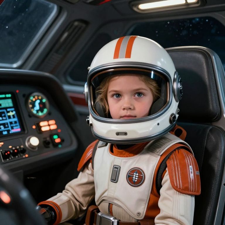 Photograph of a young child with light brown hair, wearing a white astronaut helmet with orange stripes, and a white and orange astronaut suit, seated in a spaceship cockpit. The child's large, blue eyes gaze forward. The cockpit features a control panel with colorful buttons and screens in the background. The child's suit has a circular badge on the chest. The scene is lit with a soft, artificial light, highlighting the child's face and the detailed textures of the suit and helmet. The background is dark, emphasizing the spaceship's interior.