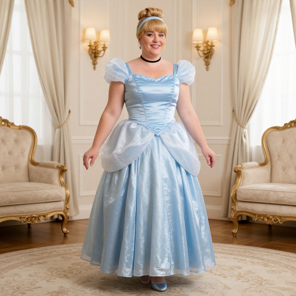 Plus Size Cinderella Costume, woman in a blue dress standing in a room