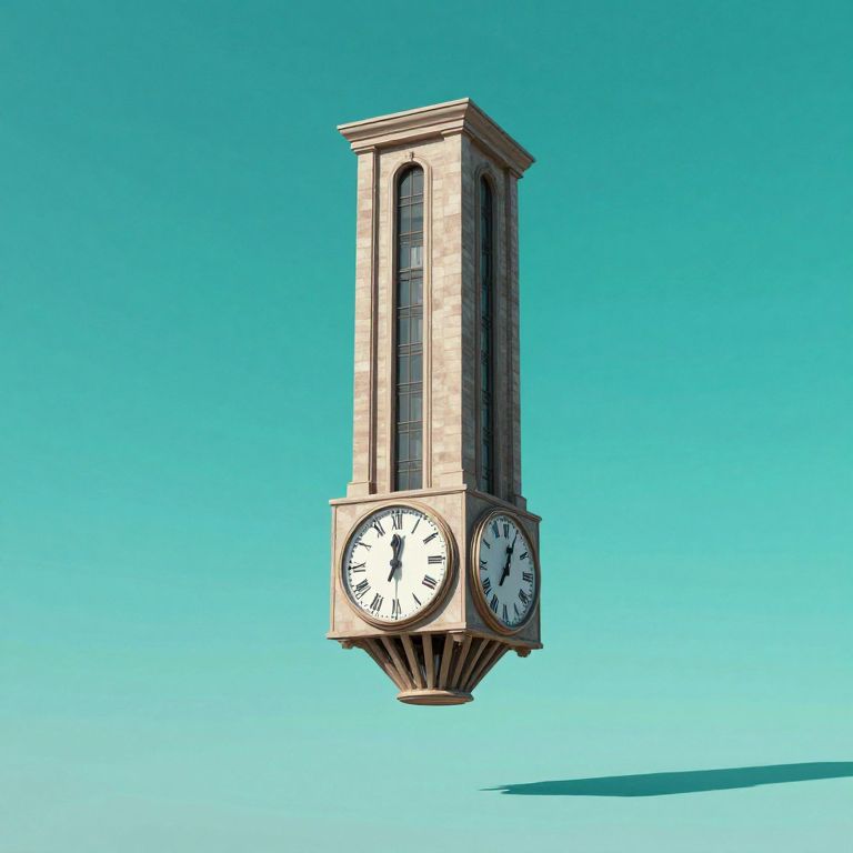 A surreal 3D-rendered scene depicts a towering clock structure inverted against a vibrant teal sky, casting ethereal shadows that defy gravity, evoking a dreamlike, high-definition visual effect that challenges perceptions of time and reality.