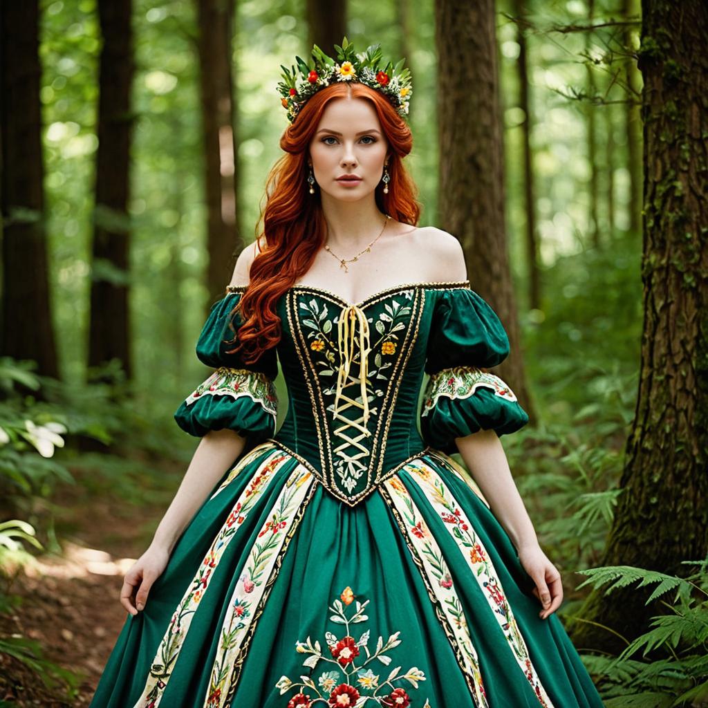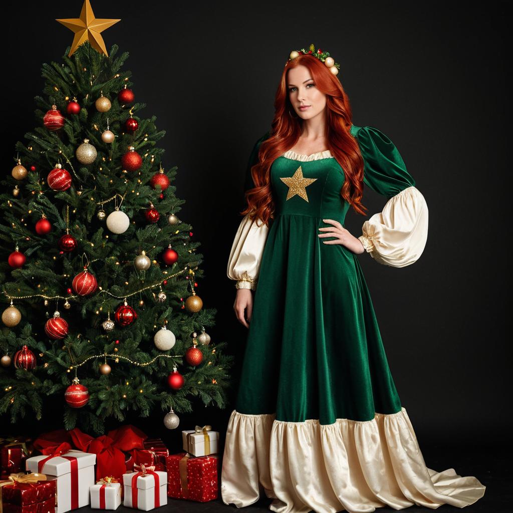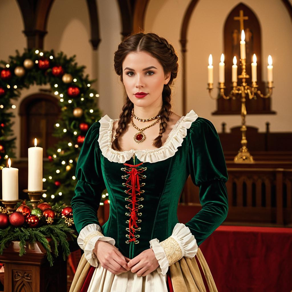 Victorian carol singer, photo-realistic, Renaissance-style woman, brown braided hair, green velvet long-sleeve dress, red and gold corset, white ruffled blouse, beige skirt, ornate necklace, candle-lit church background, Christmas wreath, wooden arches, warm lighting, festive decorations, detailed ures, historical clothing, period piece, holiday setting, realistic, high detail, ornate patterns, realistic skin tone, serious expression