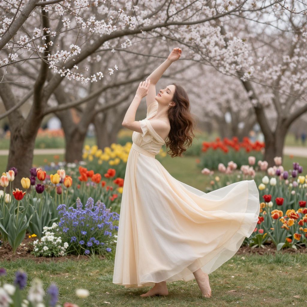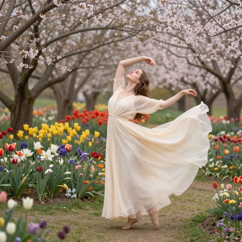 Photograph of a fair-skinned, brown-haired woman in a flowing, off-white, Renaissance-style dress dancing barefoot in a vibrant spring garden. She extends one arm upwards and the other outwards, with a graceful, joyful expression. The background features blooming cherry trees with white flowers, and a colorful array of tulips in red, yellow, white, and purple, interspersed with blue forget-me-nots. The grass is lush and green, and sunlight filters through the branches, casting a soft, dappled light on the scene. The image exudes a sense of enchantment and natural beauty.