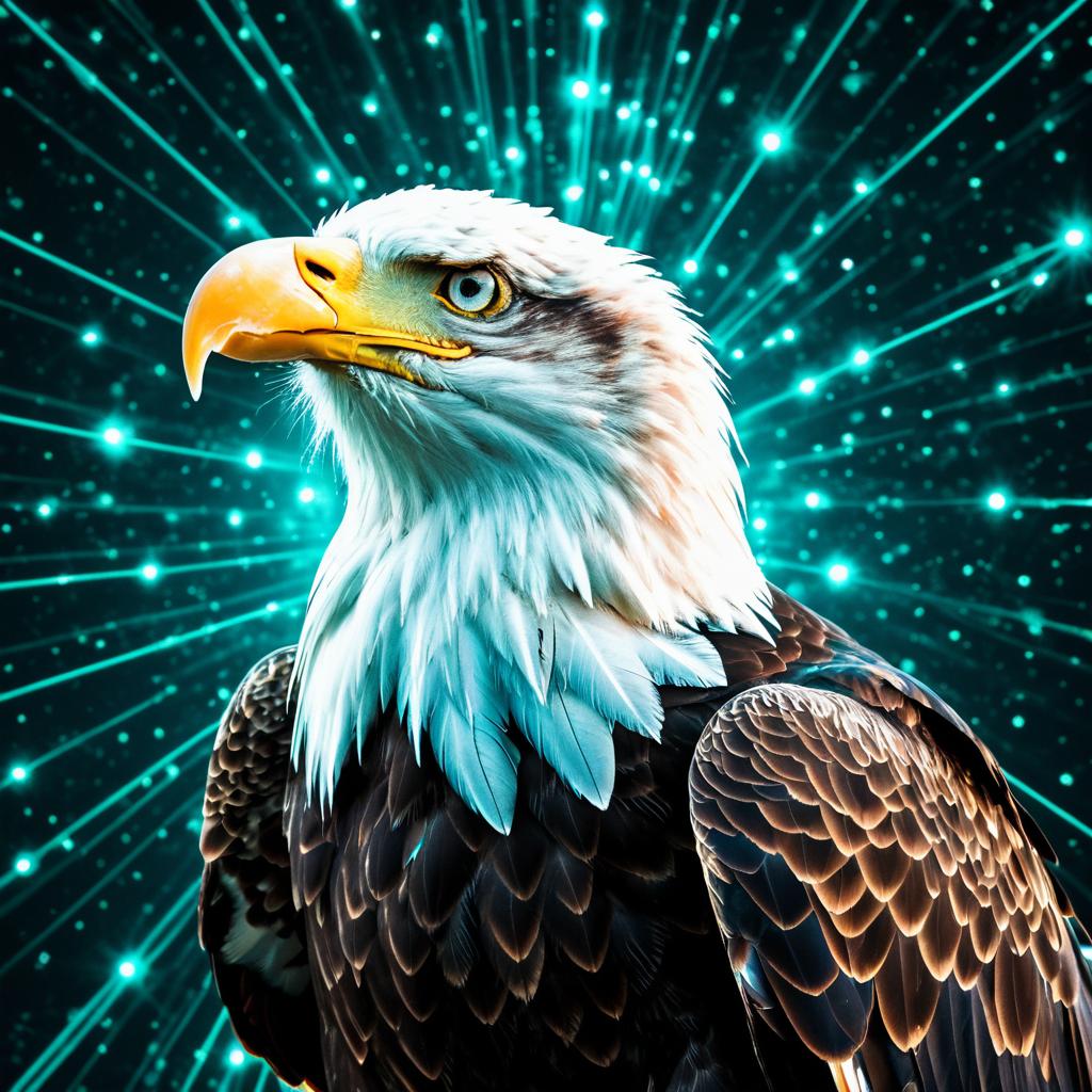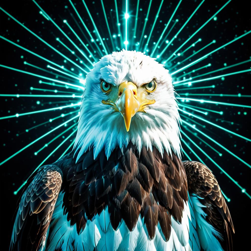 Radiant isotope, a bald eagle's essence distilled into its purest radioactive form, its glowing body a study in the beauty of atomic particles, luminescent cyan flares, constantly evolving quantum shapes