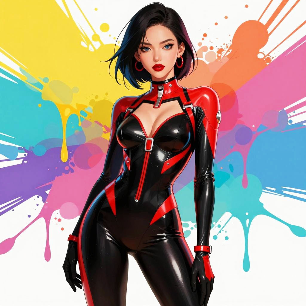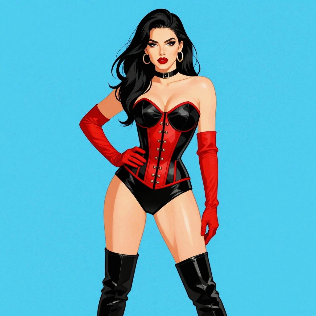 This vibrant digital artwork features a confident woman in a stylized, anime-inspired illustration style. She wears a black and red corset paired with matching gloves and thigh-high boots, set against a bright blue dotted background that enhances the dynamic and bold composition.