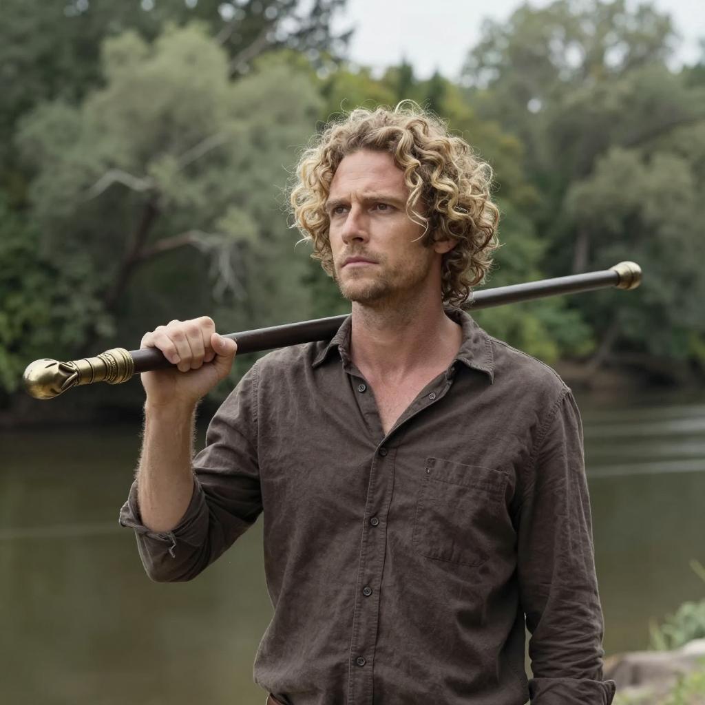 Two men in a forest, holding bows. The man on the left has long brown hair, rugged face, and a sleeveless tunic. The man on the right has a bald head, gray beard, and a gray shirt. The man in the foreground has dark hair and is seen from the back. Both men have serious expressions. Background includes green trees.