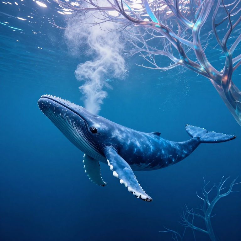 A majestic blue whale gracefully swims through a surreal underwater forest of ethereal trees, their translucent branches shimmering with a dreamlike glow as the creature releases a misty plume from its blowhole, creating a mesmerizing blend of natural beauty and otherworldly tranquility in this high-definition digital artwork.
