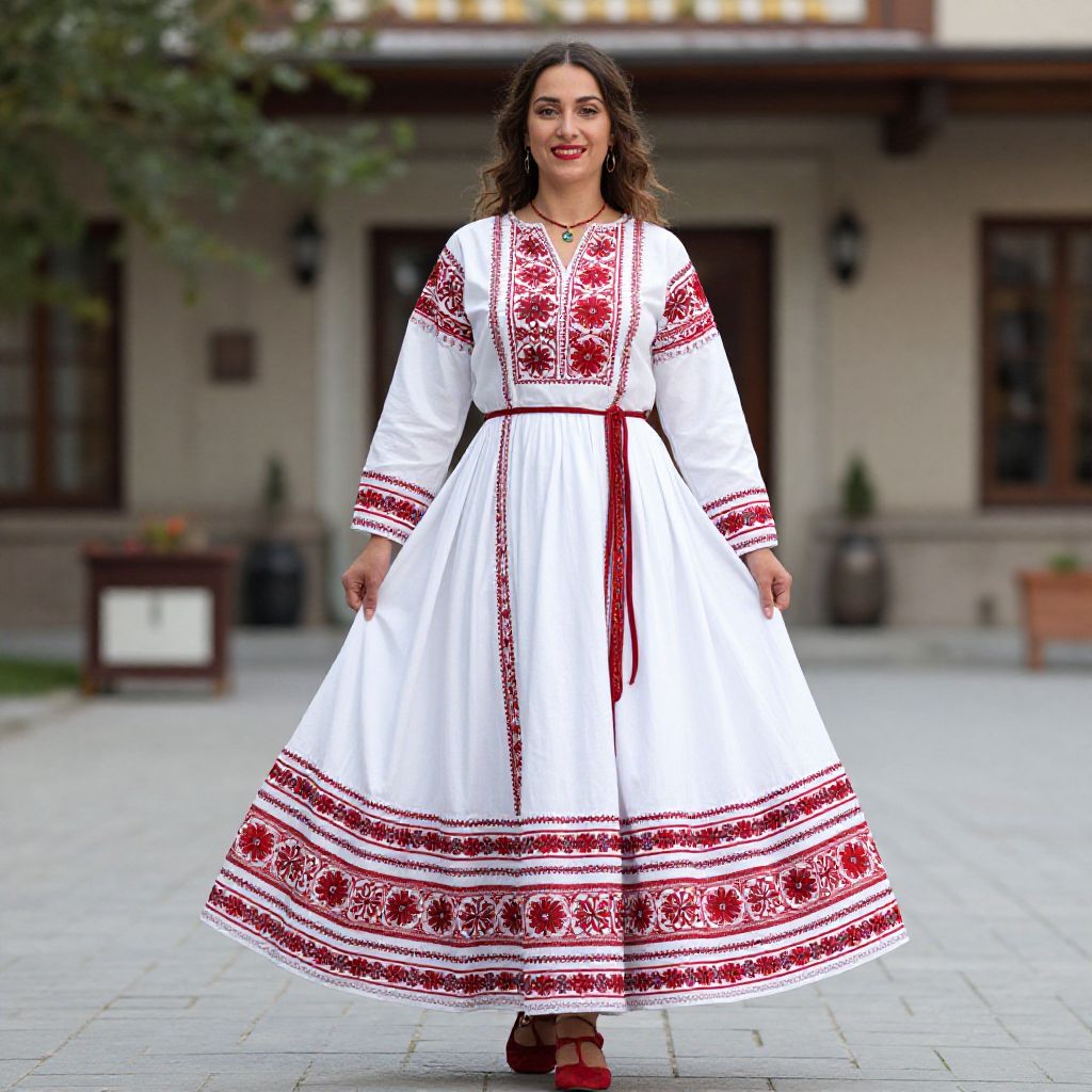 "Turkish Folk Dress, a woman in a white dress with red trim and a red and white dress"