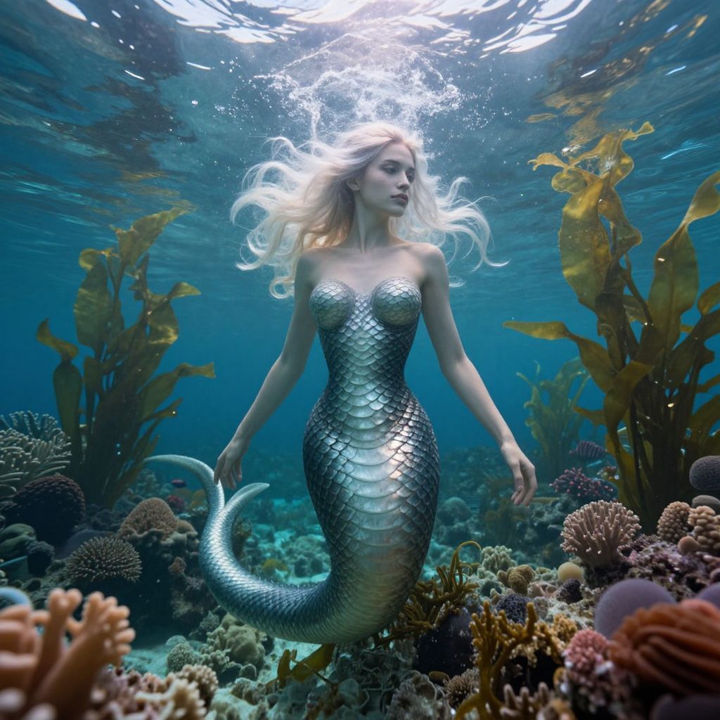 Photograph of a silver mermaid with flowing blonde hair, surrounded by underwater coral and seaweed, illuminated by sunlight above.