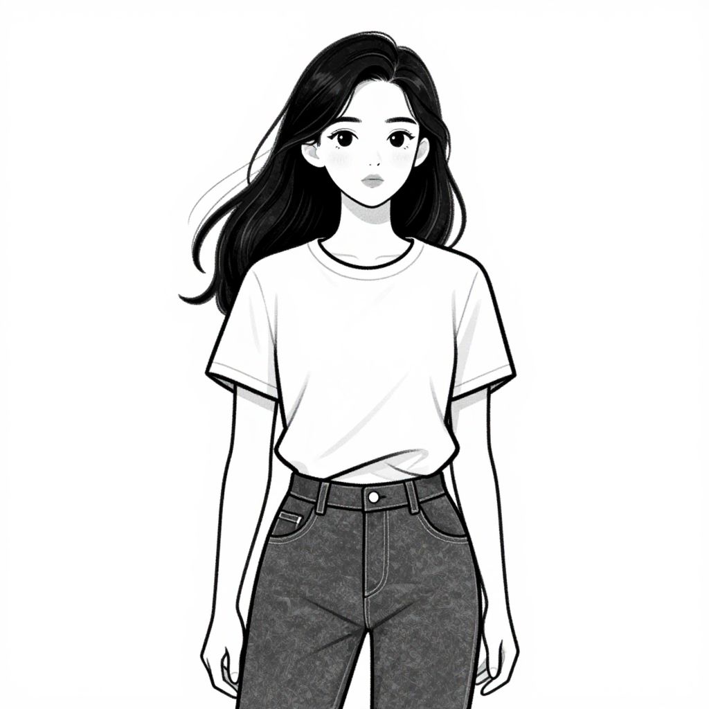 This digital black-and-white drawing depicts a young woman with long, straight black hair and large, expressive eyes. She is wearing a plain white short-sleeved t-shirt that slightly rides up, revealing a hint of her midriff, and high-waisted dark blue jeans. Her hands hang loosely by her sides. The background is entirely white, emphasizing the simplicity and focus on the subject. The art style is clean and minimalist, with smooth lines and subtle shading, giving the illustration a slightly manga-inspired appearance.