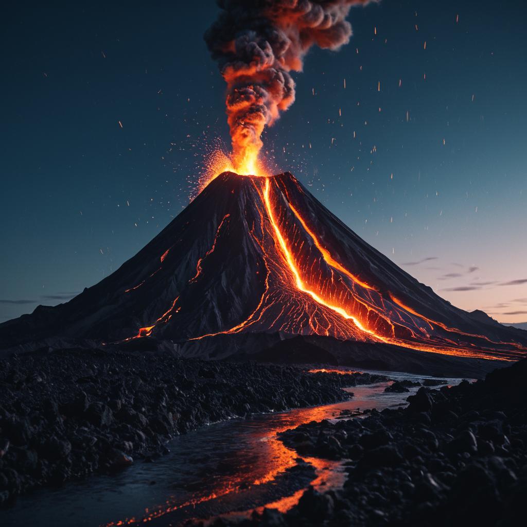 A hyperrealistic digital render of a volcanic archipelago featuring glowing red lava pillars and geometric platforms surrounded by molten lava. Dark stormy skies with thick volcanic ash clouds dominate the background, creating a dramatic and cinematic atmosphere. The scene showcases intricate lava flows and a large erupting volcano in the distance, blending surreal and dreamlike elements in a Beeple-inspired style, captured with a wide 28mm perspective.