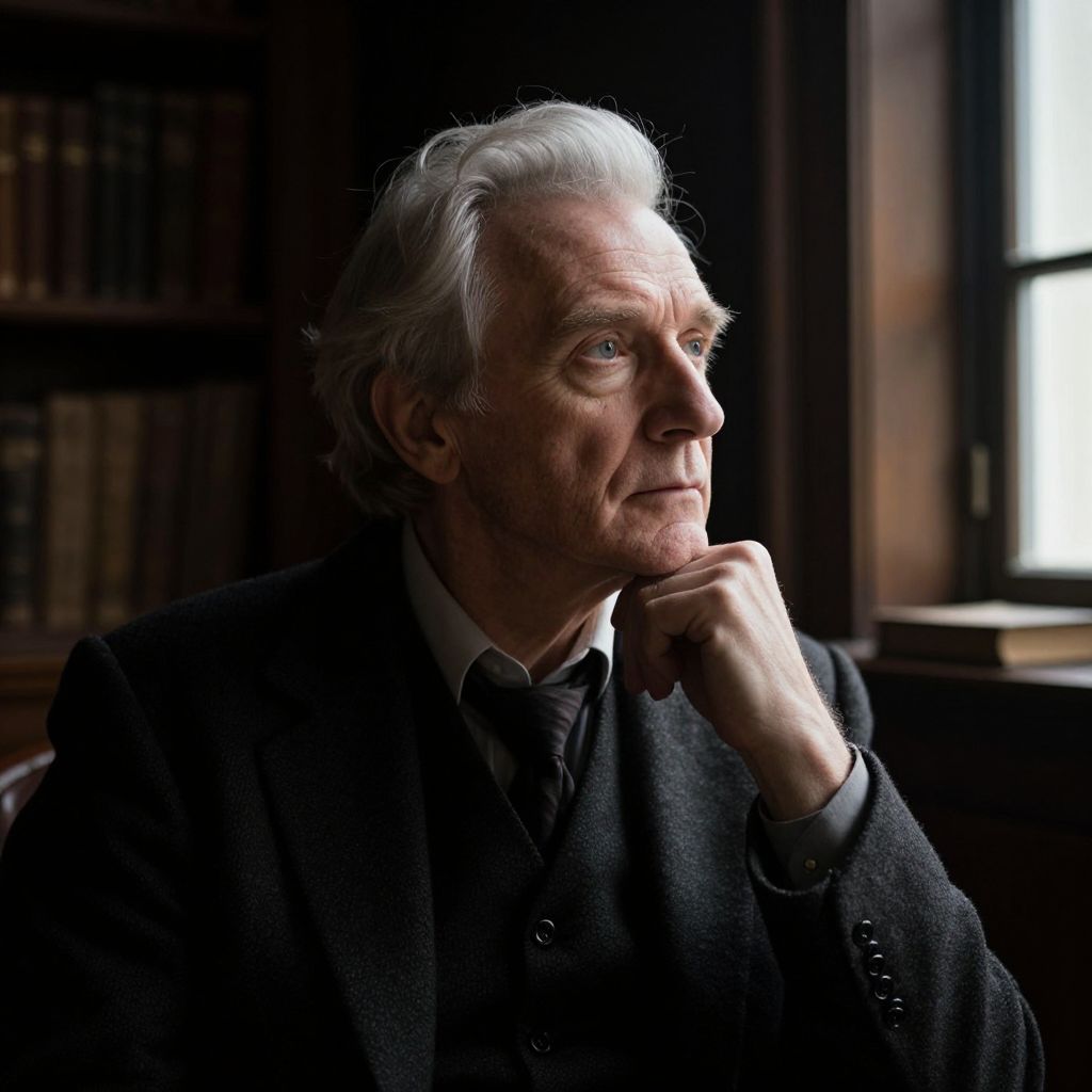 Visualize a super-realistic portrait of a distinguished gentleman with silver hair, intense blue eyes, and a rugged yet refined visage. Set against an old-world library's rich, dark backdrop, he sits in contemplation, his profile illuminated by a single beam of light from a nearby window. The warm glow casts shadows that accentuate the lines on his face, evoking wisdom and introspection amidst ancient knowledge. This image blends classical portraiture with artistic chiaroscuro, reminiscent of Rembrandt's mastery, capturing the essence of character and thoughtfulness.