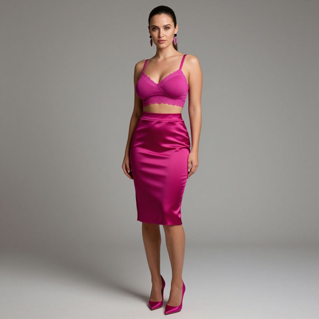 Photograph of a confident woman with dark hair in a slicked-back style, standing against a plain gray background. She wears a bright pink, lace-trimmed bralette with thin straps, paired with a high-waisted, satin pencil skirt that reaches mid-calf. Her matching pink high heels complement her outfit. She has light skin, and her makeup is subtle, highlighting her natural features. She accessorizes with large, dangling pink earrings. Her pose is relaxed yet poised, with her right arm slightly bent and her left arm hanging naturally by her side. The lighting is even, emphasizing the smooth texture of her satin skirt.