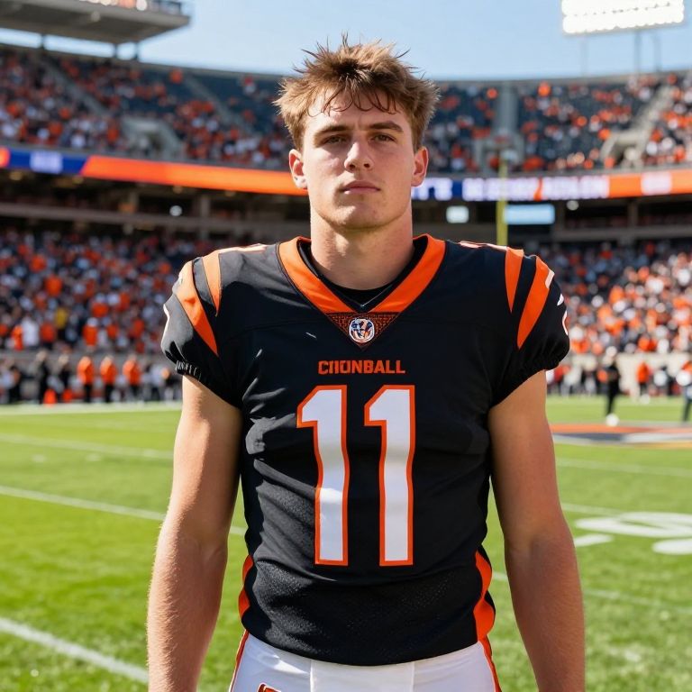 Photograph of a young, white male football player standing on a bright green field, wearing a dark navy blue Cincinnati Bengals jersey with orange accents and the number 11. He has short, messy brown hair and a serious expression. The background shows a stadium filled with fans, some wearing orange, with a blue sky above. The player is centered in the frame.