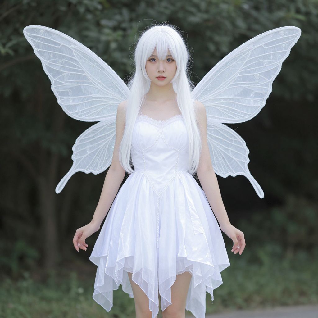 Photograph of an East Asian woman dressed as a fairy. She has long, straight, white hair and wears a white, sleeveless, tiered dress that flares out. Her large, translucent white wings have a delicate, lace-like texture. She stands against a dark, forested background, which contrasts with her bright white attire. Her pale skin and red lipstick add a touch of color to her otherwise monochromatic look. The image has a soft, ethereal quality, highlighting her fairy-like appearance.