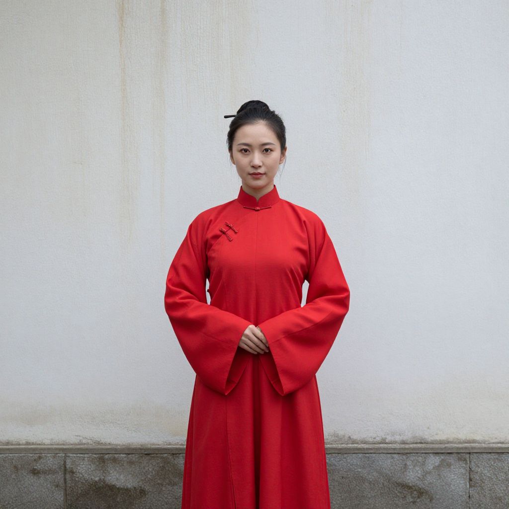 Photograph of an East Asian woman standing against a plain white wall. She has fair skin, black hair tied in a high bun, and is wearing a bright red, long-sleeved qipao with a high collar and wide sleeves. The dress has a small decorative button on the left shoulder. She stands with her hands folded in front of her. The wall behind her is slightly textured with a concrete base at the bottom. The overall image is sharp, with high contrast and vibrant red color of the dress standing out against the white background.