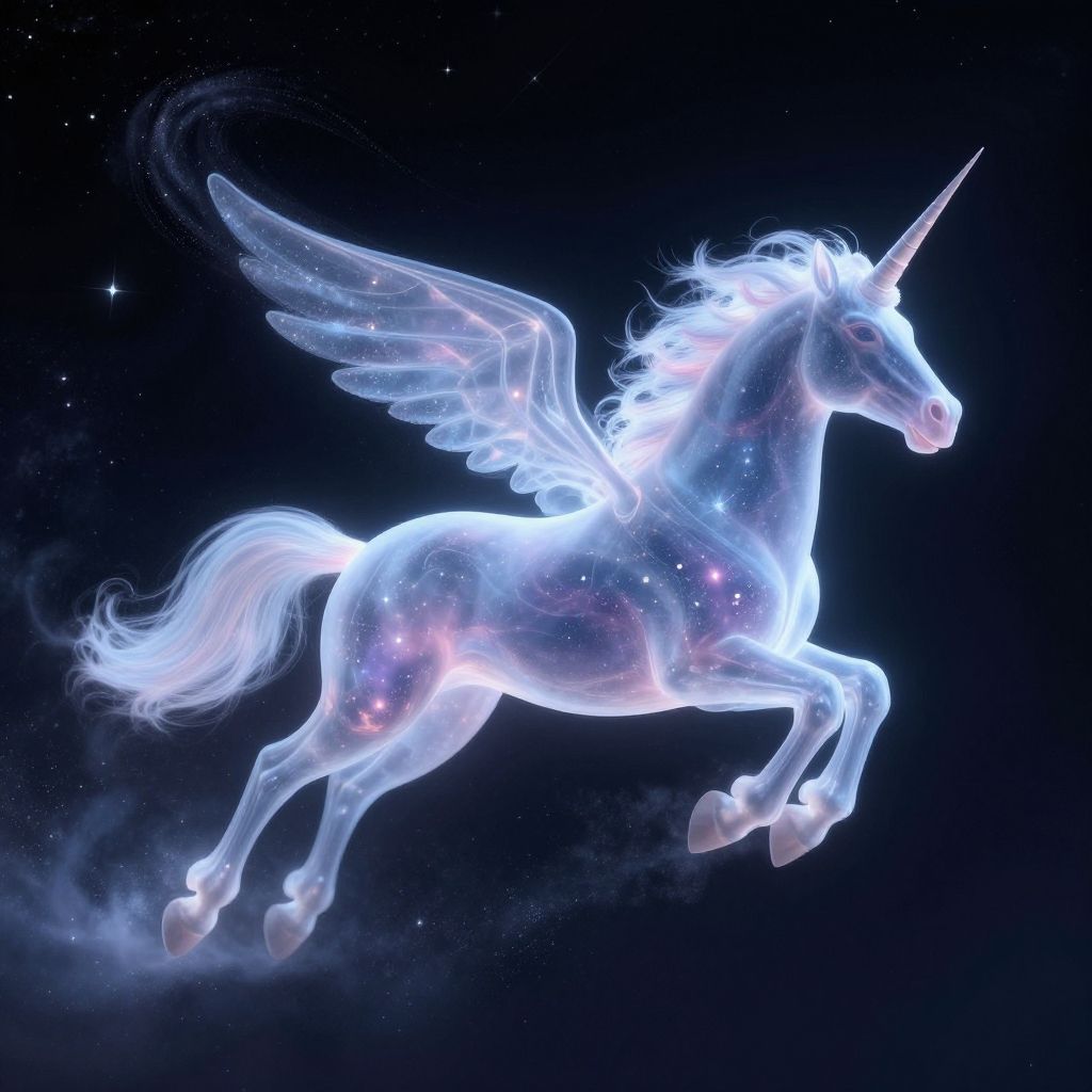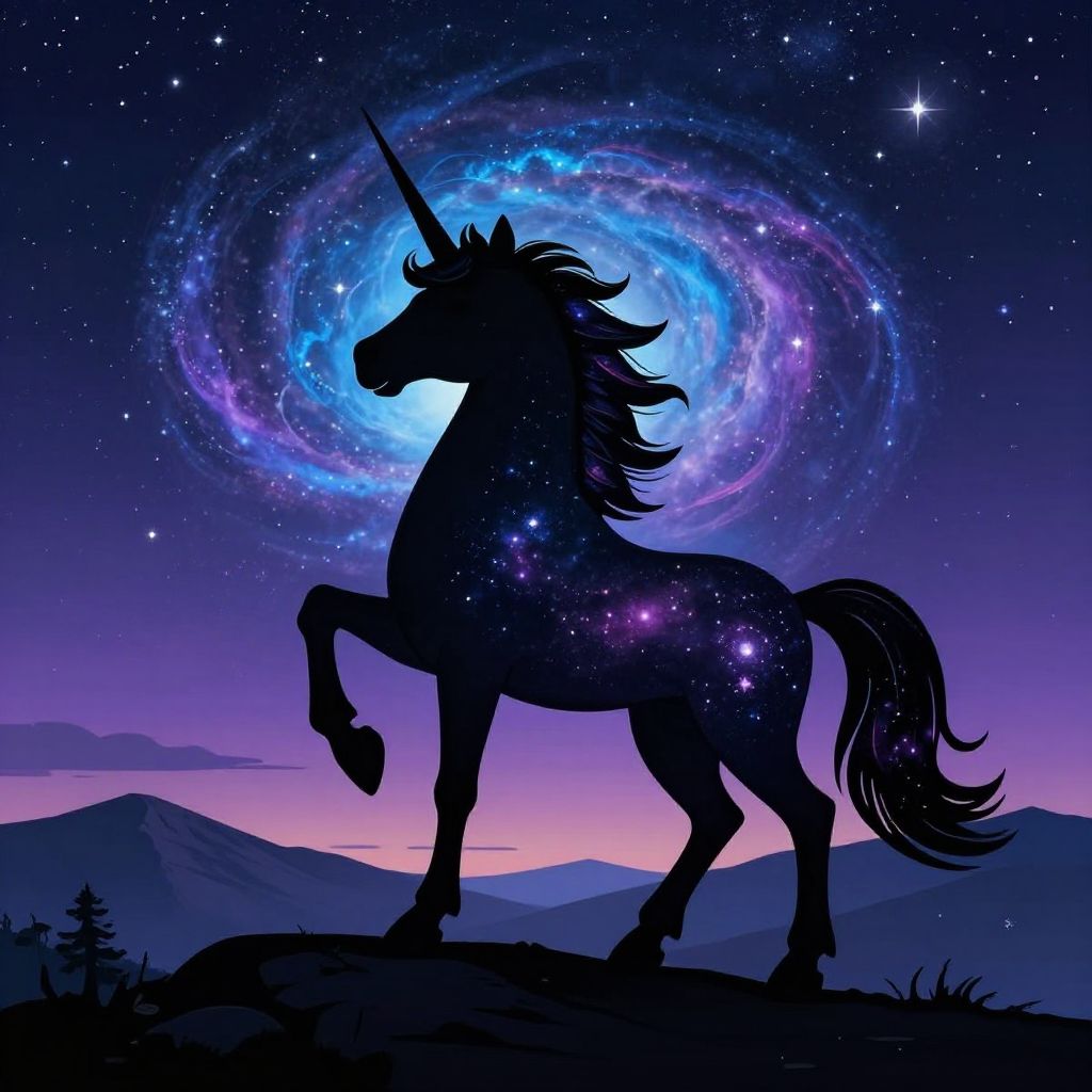 Silhouetted unicorn with a glowing spiral galaxy and stars in the night sky, standing on a mountain ridge under a purple and pink sunset. Digital