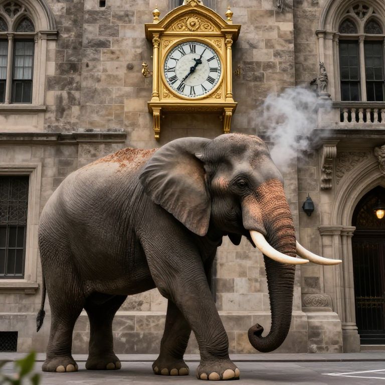 In a city where history whispers through stone walls and time ticks audibly on the grand, golden clock adorning its forehead, a majestic elephant strides forward, its steaming tusks and regal bearing symbolizing the relentless march of progress amid the weighty echoes of the past.