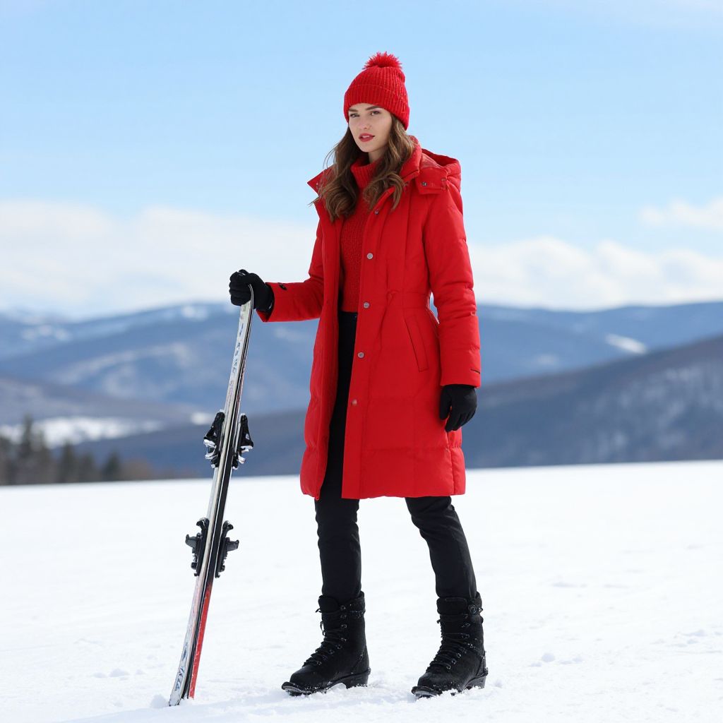 "Winter Style Woman Costume, woman in red coat and hat standing in snow with skis"