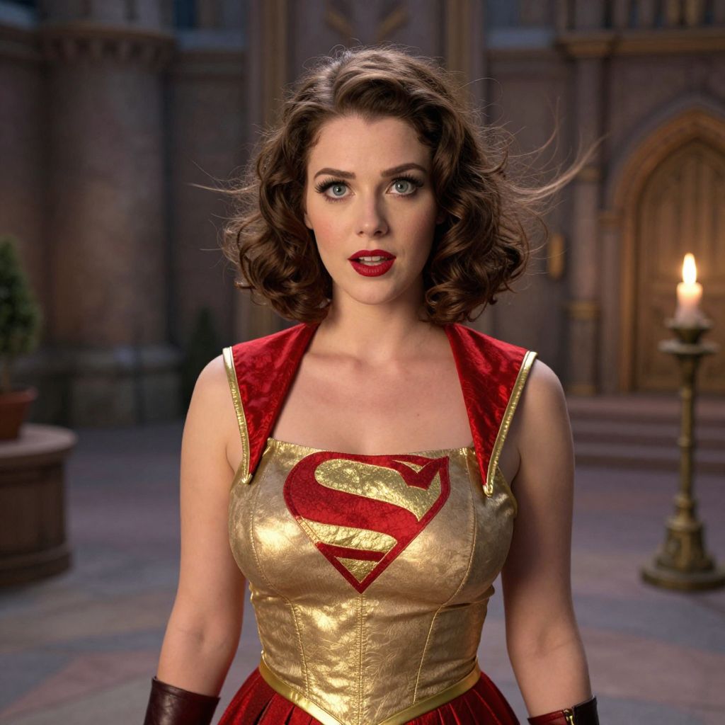 A young woman with a bob wavy hairstyle stands in a dimly lit fantasy castle courtyard, wearing a vintage 1950s superhero costume with red and gold accents, her expressive face lit by candlelight, detailed hair gently flowing in the wind, realistic photography style. The woman has big tits and cute face