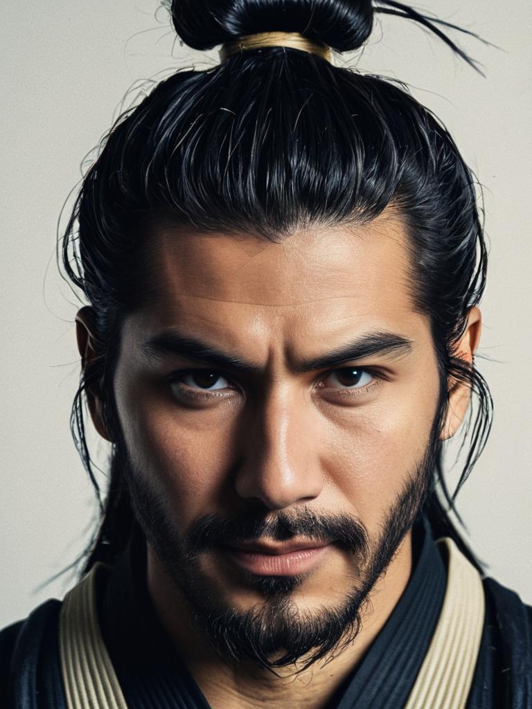 Man in Samurai Man Bun Hairstyle costume, photorealistic close-up headshot