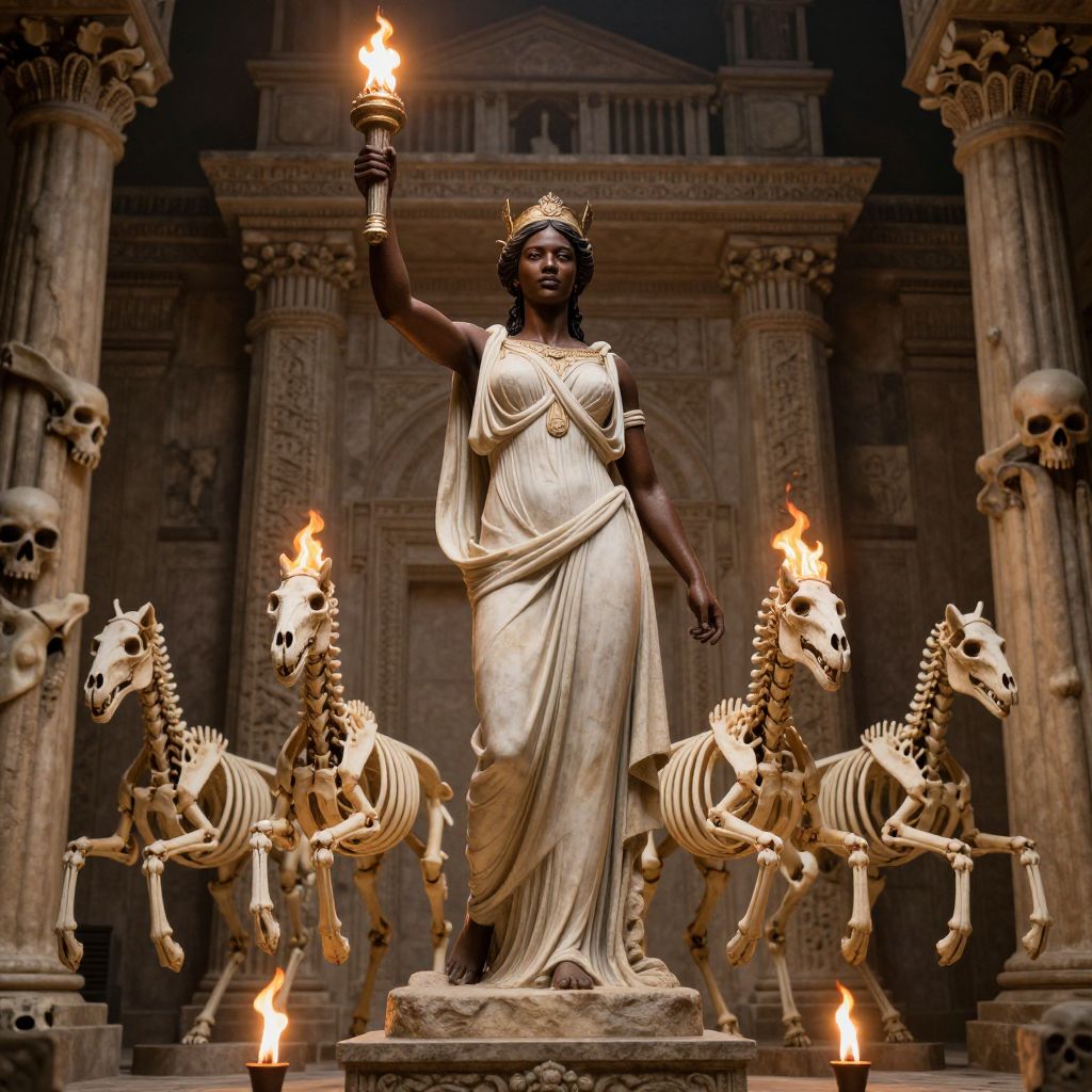 A highly detailed, cinematic lighting, hyper-realistic statue of a black woman in a Greek goddess style, holding a torch, standing tall over an ancient city with a monolithic background of bones and skulls, with tourches burning at the base and three running horse skeletons with fire for their manes and tails in the background.
