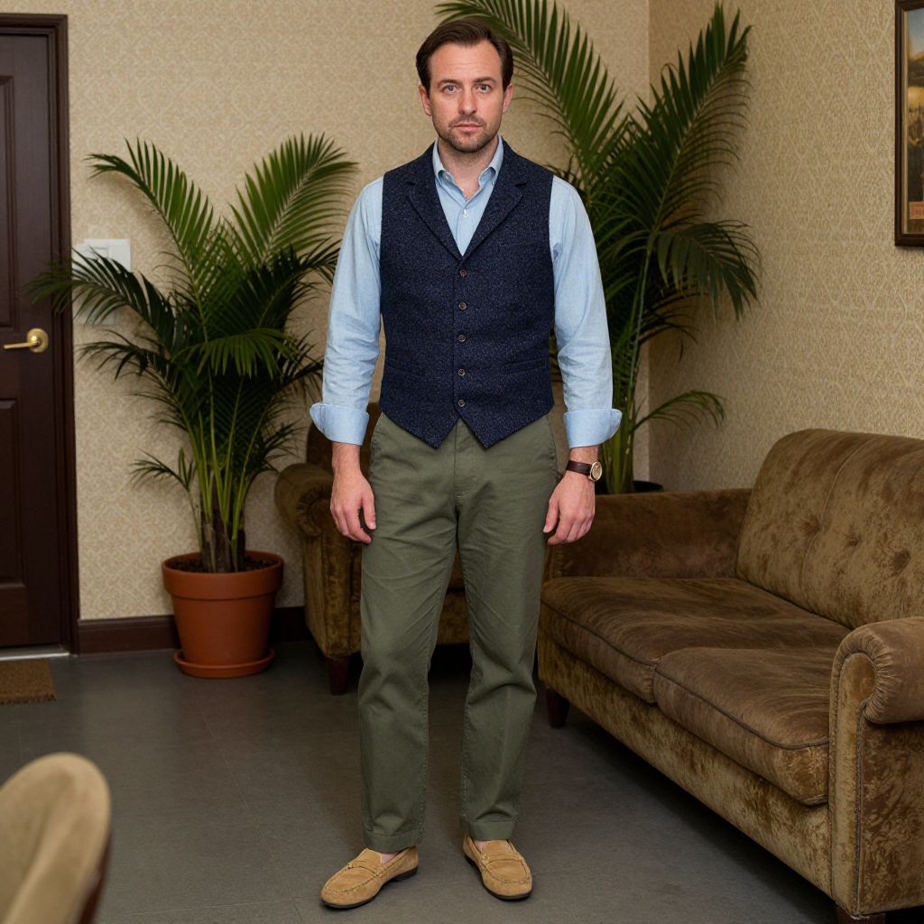 A man, navy herringbone tweed waistcoat, light blue chambray shirt, olive green chinos, tan suede loafers, standing in a cozy lobby with patterned wallpaper, potted plants, worn-out couches, Cibachrome style, relaxed expression. Man has masculine face and piercing eyes
