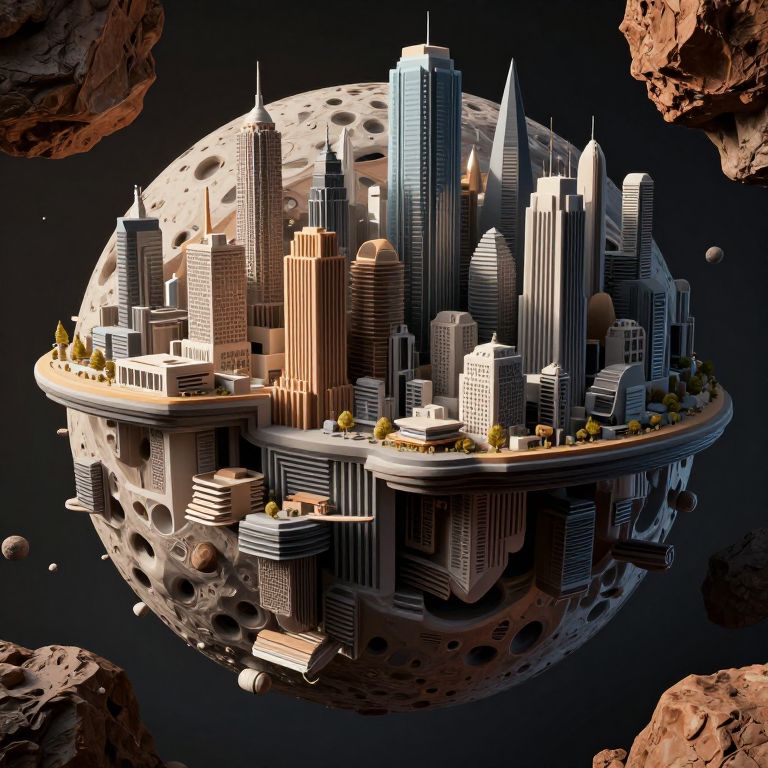 Digital CGI of a futuristic city floating on a cratered, moon-like planet with skyscrapers, trees, and rocky surroundings in a dark space.