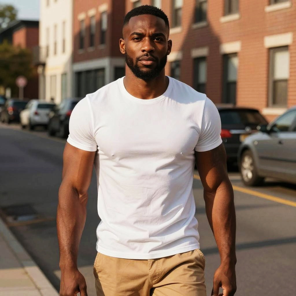 Photograph of a handsome, muscular African-American man with short-cropped hair and a trimmed beard. He's wearing a tight, white t-shirt that showcases his defined biceps and tan pants. He stands confidently on a sunlit urban street with brick buildings and parked cars in the background. The bright sunlight casts warm, golden shadows, adding a vibrant, late-afternoon glow to the scene.
