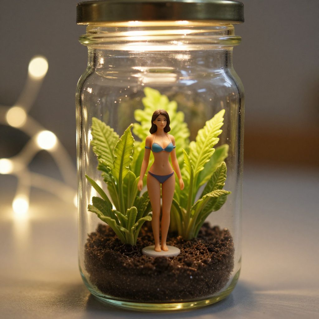 Glass jar containing a miniature figurine of a woman in a bikini, surrounded by vibrant green plants and soil, illuminated by a warm light against a backdrop of glowing bokeh lights.