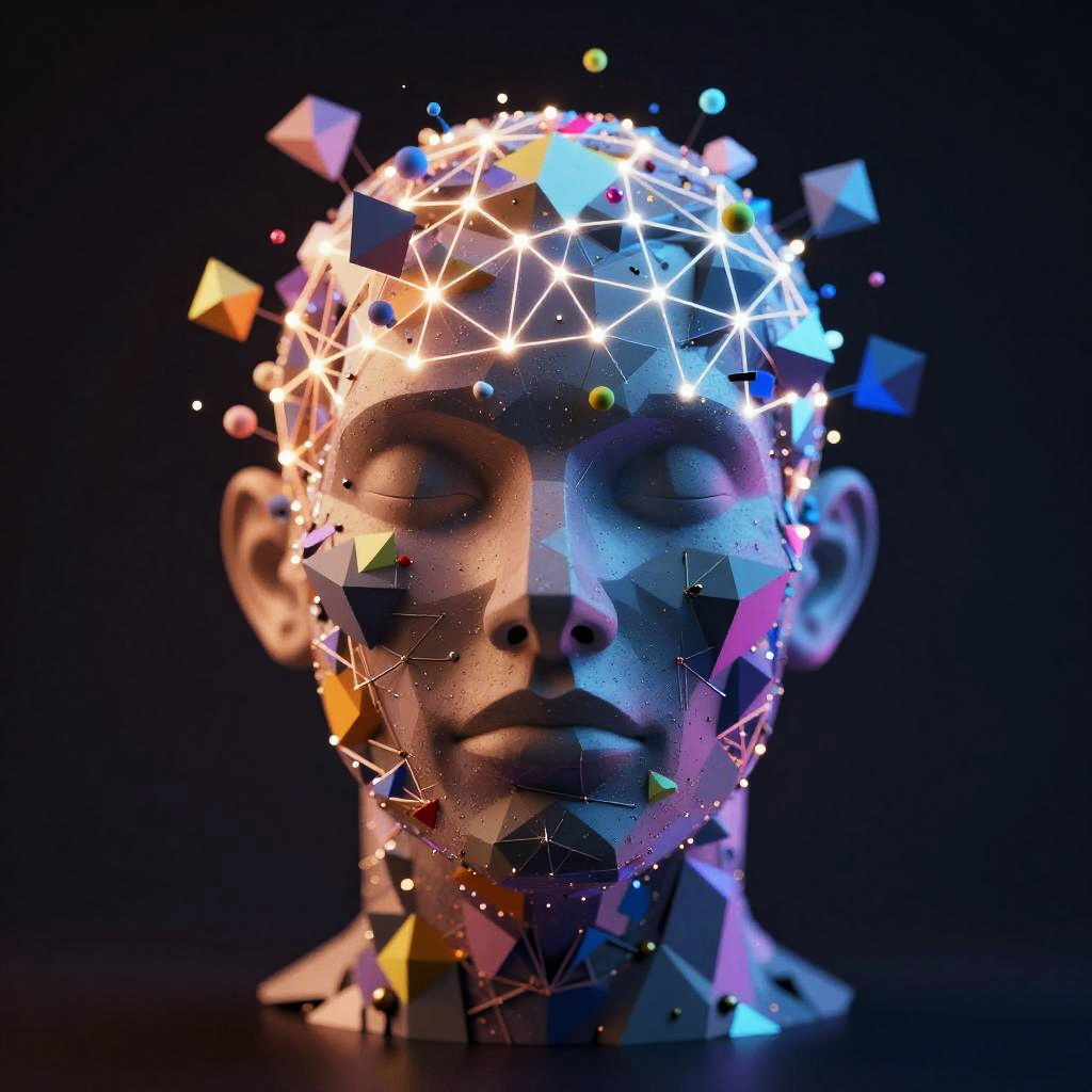 AI generate album cover illustrating an abstract human face made of floating geometric shapes and glowing neural networks, radiating a sense of creativity and intelligence, set on a dark background with vibrant colors highlighting the fusion of AI and artistic inspiration.