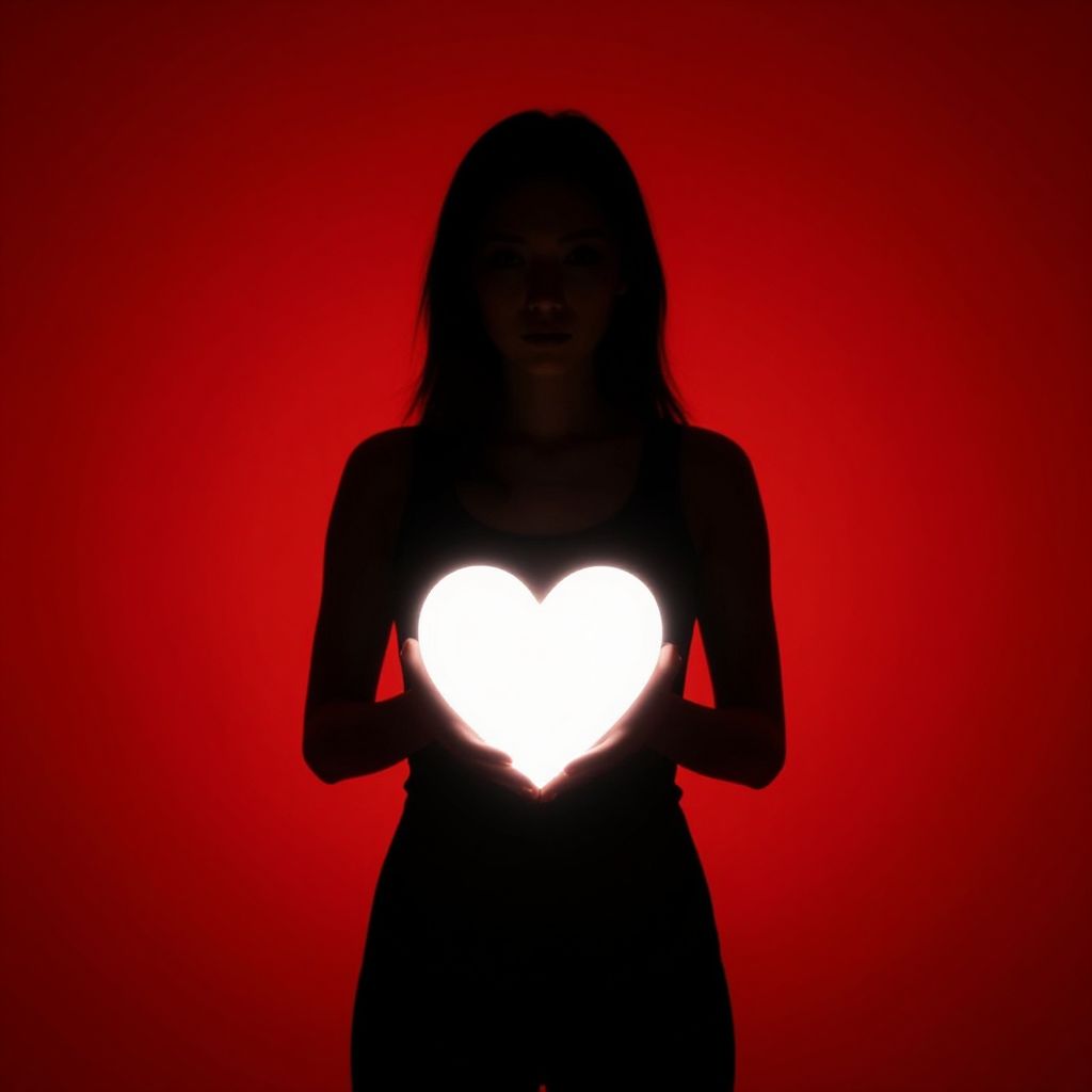 A silhouette of a woman holding a glowing heart against a vibrant red background, captured in a dramatic lighting style with a high-definition, cinematic quality.