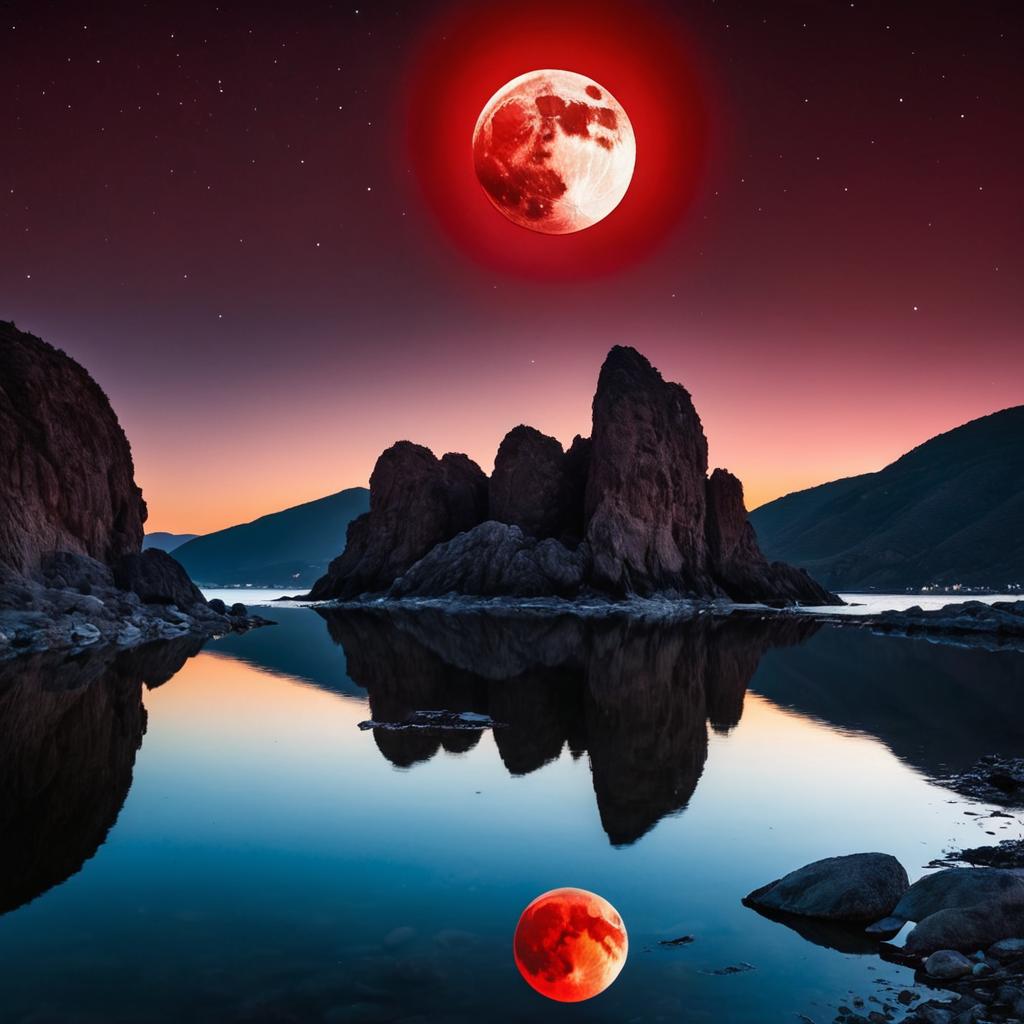 Moon, full moon, scenery, sky, no humans, cloud, outdoors, night, red moon, water, night sky, reflection, nature, star (sky), bird, rock