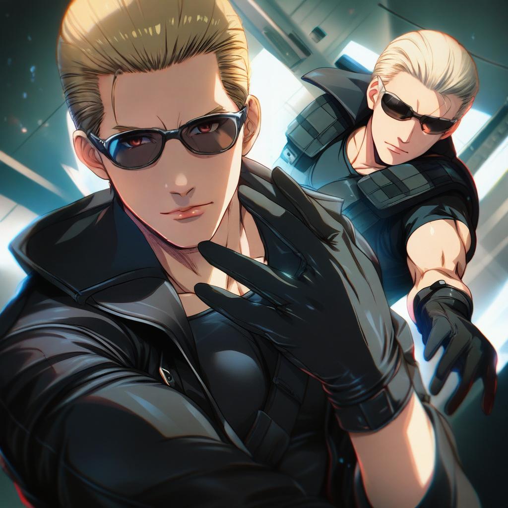 Digital illustration of two animated Albert Wesker characters from Resident Evil, featuring blonde slicked-back hair, red eyes, black sunglasses, black gloves, and muscular build. Both wear black tactical clothing and display confident poses in a dynamic, modern environment.