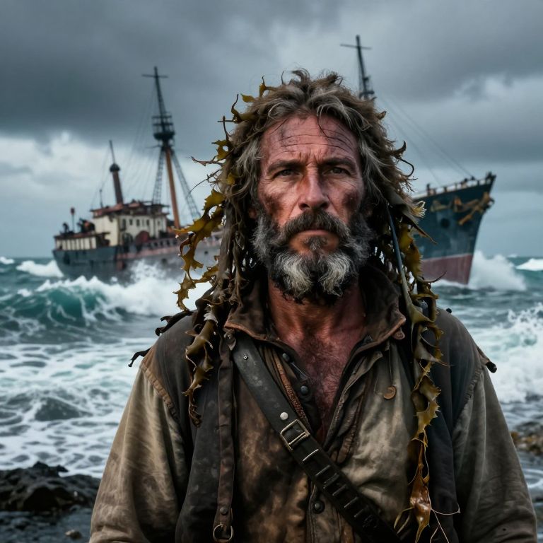 A rugged shipwreck explorer with weathered features and a graying beard adorned by kelp tendrils poses against a dramatic seascape backdrop. Towering waves crash upon a ship, casting shadows over both ocean and subject alike. This double exposure captures the sailor's life, where salt-etched creases on his face echo the kelp's undulations. The atmosphere conveys resilience amidst solitude, inviting contemplation of untold tales from one who has weathered nature's storms.