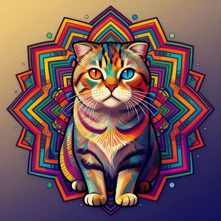 The image features a vibrant and intricately designed Scottish Fold cat, adorned with a multitude of colors and patterns. The cat's eyes are strikingly multicolored, with hues of blue, orange, and green, adding a sense of depth and dynamism to its gaze. The cat's fur is depicted with a variety of textures, from smooth to slightly rough, creating a realistic and tactile appearance. Surrounding the cat is a mandala-like design, composed of geometric shapes and patterns in a rainbow of colors, including red, orange, yellow, green, blue, and purple. The mandala is not only a backdrop but also an integral part of the composition, enhancing the overall visual complexity. The cat's body is outlined with a series of lines and strokes, giving it a sense of movement and energy. The background is a gradient of light and dark shades, providing a stark contrast to the colorful foreground. The image is a blend of art deco and hippie styles, with a touch of cyberpunk, creating a unique and visually captivating piece. The cat's expression is calm and serene, with a slight hint of a smile, adding a touch of warmth to the scene. The overall composition is balanced and harmonious, with the cat and mandala elements working together to create a cohesive and engaging visual experience.