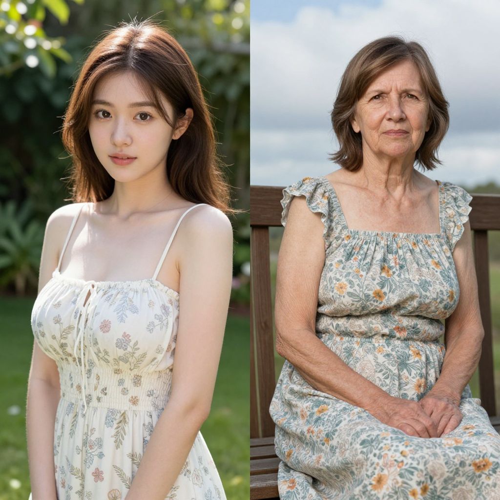 A side-by-side realistic photography comparison showing a young woman with smooth, fresh skin and bright eyes standing in a sunny garden, contrasted with an older woman with deep wrinkles and weathered skin sitting on a wooden porch under a cloudy sky, both wearing similar floral dresses to highlight the contrast between youth and age. The woman has big tits and cute face