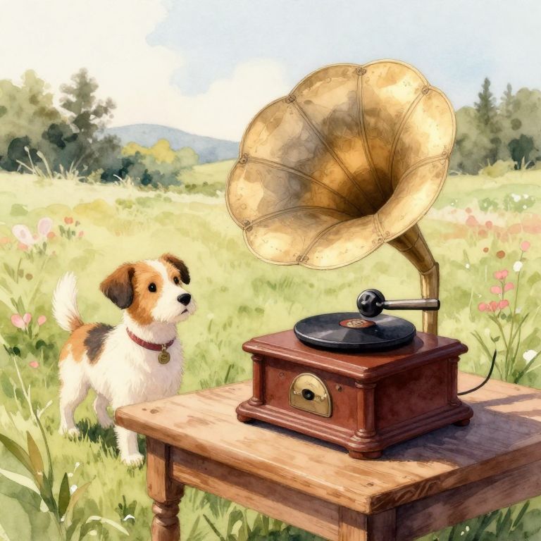 An enchanting watercolor painting of Nipper the dog in a countryside setting, old-fashioned gramophone placed on a wooden table, morning light casting gentle shadows, serene mood, soft brush strokes, pastel colors blending nature with vintage charm.