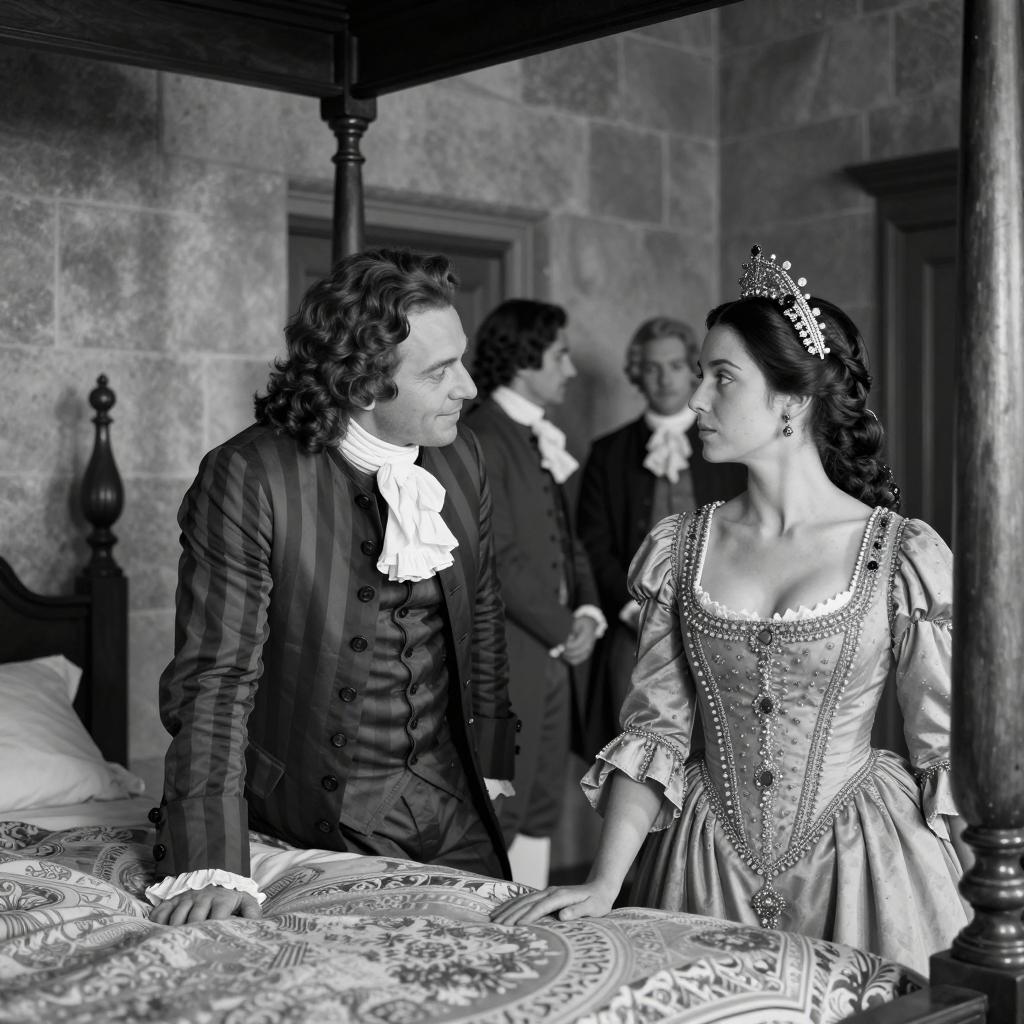 Woman with blonde curls, pink and white lace dress, large breasts, necklace, eyes closed, mouth open. Man with white curly wig, gray and white ornate robe, gesturing, intense expression. Floral curtain background, ornate gold frame, chandelier reflection. Both facing each other, woman slightly leaning back, man to the right. Two people.