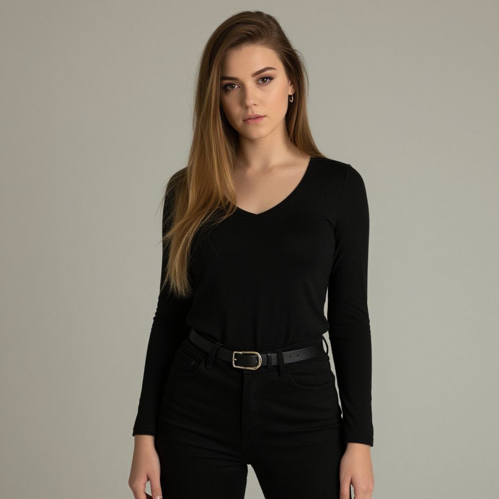Photograph of a young woman with long brown hair, wearing a black long-sleeve V-neck top and black pants, belted at the waist